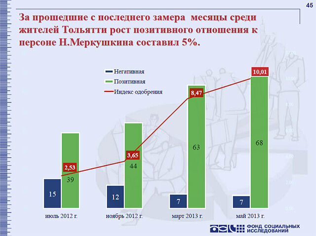 Итак, миф первый. Сергей Андреев против Николая Меркушкина. Но сначала об умозрительном тезисе, что целенаправленная пропагандистская кампания против тольяттинского мэра с использованием всех возможных медийных ресурсов вкупе с ошибками самого Андреева стремительно и последовательно обрушивает рейтинг «сектанта» и друга олигарха. Сухие цифры говорят нам, что уровень поддержки мэра Тольятти вместе с оценкой деятельности его администрации с ноября 2012 года практически не изменился или изменился на долю статистической погрешности. Восемь месяцев назад позитивно относились к мэру и поддерживали его 46% горожан, а сейчас – 44%. Да, доля его противников за тот же период выросла вдвое – с 13% до 26%. Но, что любопытно, число антагонистов Андреева увеличилось за счёт тех, кто городской политикой раньше не интересовался. То есть практически все, кто видел в Андрееве «своего мэра», продолжают оказывать ему доверие.