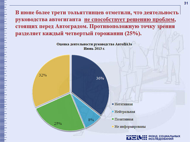 Такие, например, как весьма внушительный и многостраничный труд регионального Фонда социологических исследований под наименованием «Оценка деятельности мэра Тольятти». Сие исследование для внутреннего пользования была заказано, естественно, администрацией второго по величине города Самарской области и презентовано сугубо в закрытом режиме в начале августа. Однако оно «просочилось» в свет с лёгкой руки тольяттинского анонимного Сноудена из рядов фаворитов избирательной кампании, то есть единороссов. И, видимо, именно потому, что результаты этой социологической работы, свидетельствуют о неутешительном положении местной партии власти, а вдобавок деконструируют лубочные мифы, которые при помощи политической рекламы пытаются вбить в головы тольяттинцев и губернатора Николая Меркушкина. Оставим за скобками, кому выгоден этот «слив», и не примем всерьёз прозрачные намёки на «пятую колонну» в Едре, тем паче в лице лидера городских единороссов Николая Ренца, который якобы слишком близок с мэром города. Куда интереснее собственно изнанка насаждаемых мифов народов Тольятти. По меньшей мере, двух главных.