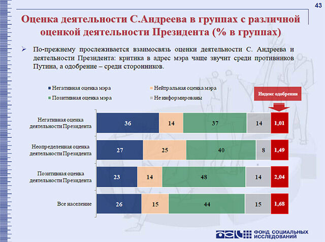 Отметим также, что рост противников глав муниципалитетов – тенденция общероссийская, характерная для периода стагнации и рецессии. И у Андреева процент недовольных им (26%) является одним из самых скромных в стране. В частности, и у мэра Самары, единоросса Дмитрия Азарова за тот же примерно период количество негативно оценивающих его работу увеличилось в два раза до 30%, но в отличие от Андреева «изменили» Азарову как раз те, кто раньше его поддерживал.
